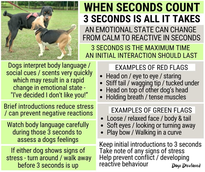 WHEN SECONDS COUNT This post is not advocating that dogs meet every other dog, but about how to go about it, if and when it does happen, in a safer way. The 3 second rule for dogs meeting each other is used as a guideline to help foster positive introductions, See more