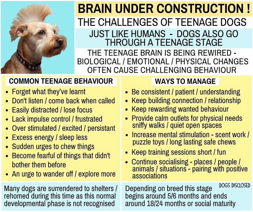BRAIN UNDER CONSTRUCTION The challenges of the teenage dog. There’s a saying that most parents of teenagers can relate to - "Parents of teenagers understand why some animals eat their young!" The changes that happen in the brain of a teenage dog are not that different to a human teenager. See more